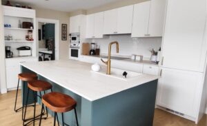 El gran punto focal del proyecto es la isla central en color verde musgo, que introduce contraste y personalidad dentro del diseño.
